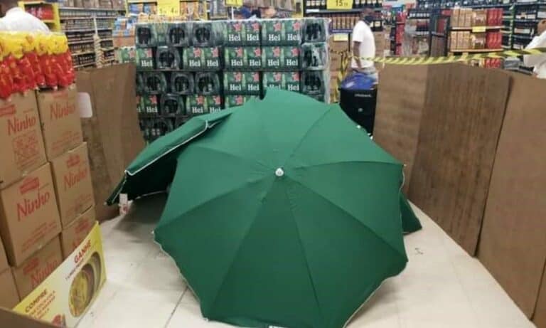 Funcionário teve mal súbito na sexta-feira (14) e foi escondido por guarda-sóis a mando dos donos do supermercado