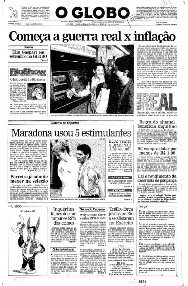 Imposto em 1994, com o estabelecimento de uma nova moeda, o real, em substituição ao cruzeiro real, o plano é apresentado como um verdadeiro milagre econômico que teria acabado com “um problema crônico da economia brasileira [a inflação, NR] e trouxe ganhos sociais e econômicos, em vez de perdas associadas a processos de estabilização” (O Estado de S. Paulo, 1/7/19).
