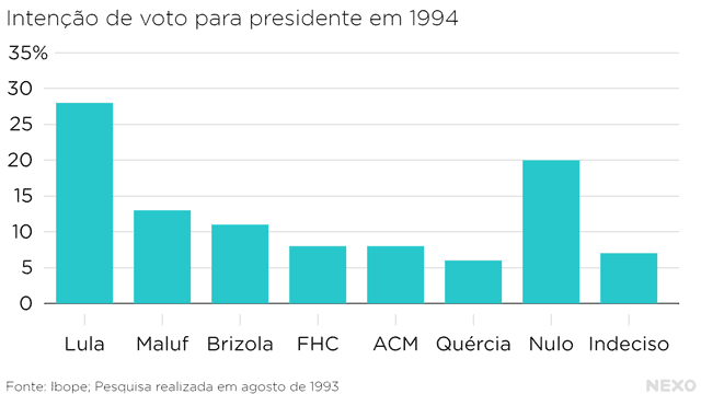 Assim o plano real se constituiu um golpe dado, pelo imperialismo e seus súditos no Brasil, para ganhar a eleição, principalmente, diante do fato de que antes do plano real, o candidato do Partido dos Trabalhadores, Luiz Inácio Lula da Silva, detinha três vezes mais intenções de voto do que quaisquer um dos possíveis candidatos dos partidos burgueses e tinha chances de ganhar as eleições no primeiro turno, como mostra o gráfico de pesquisa realiza cerca de um ano antes das eleições.