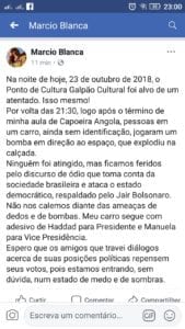 Segundo a denúncia feita pelo Facebook por Marcio Blanca, “pessoas em um carro, ainda sem identificação, jogaram uma bomba em direção ao espaço, que explodiu na calçada”. O denunciante tem em seu veículo colados adesivos de campanha da candidatura presidencial do PT.