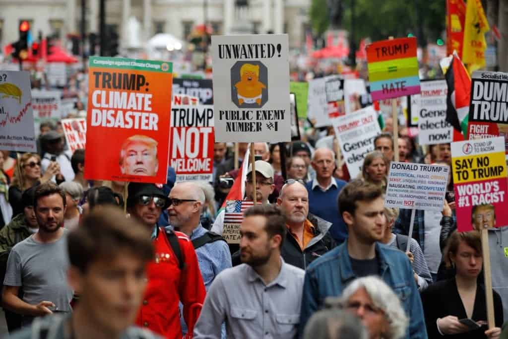 As manifestações levaram milhares de pessoas às ruas, contra o presidente de extrema-direita norte-americano, revelando a crise política gigantesca que existe, não só na Inglaterra, como no mundo todo, como ficou claro no Brasil.