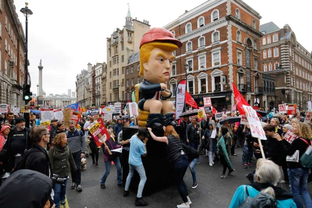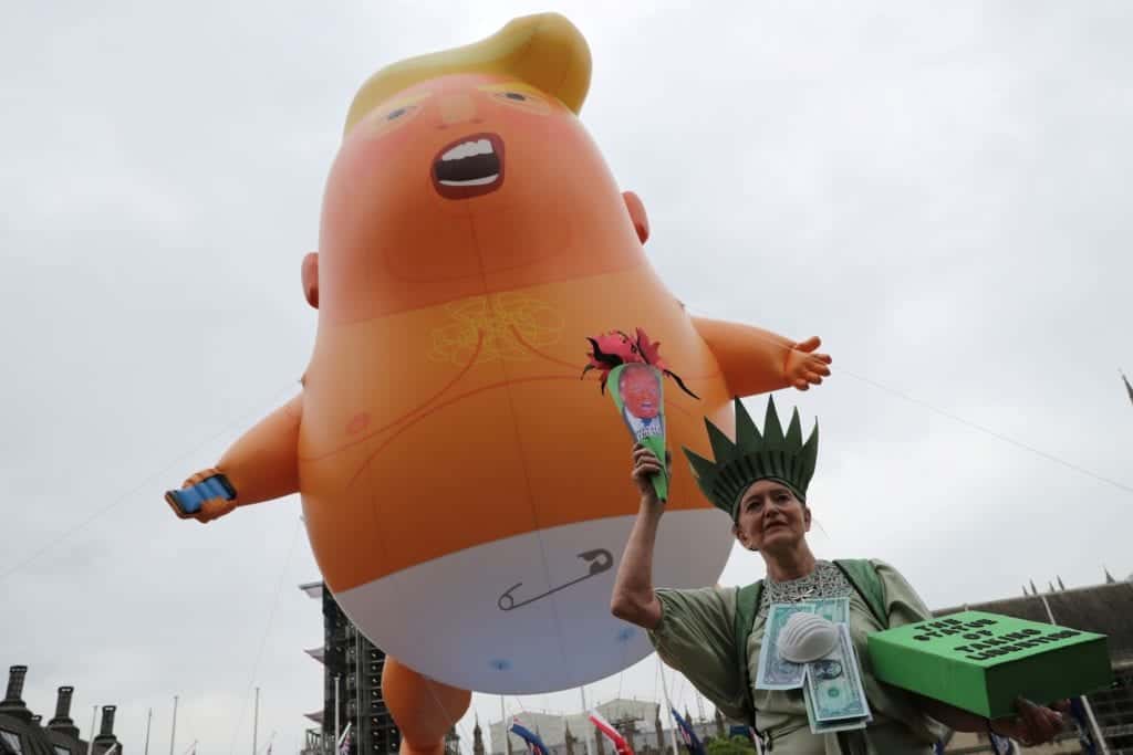 Os protestantes levaram um balão inflável apelidado “Baby Trump”, para tirar sarro do presidente norte-americano. A direita aproveitou o fato para atacar o prefeito da cidade de Londres, Sadiq Khan, que liberou o usou dos bonecos na manifestação.